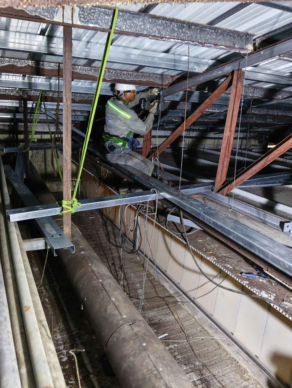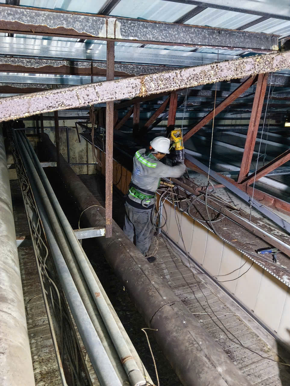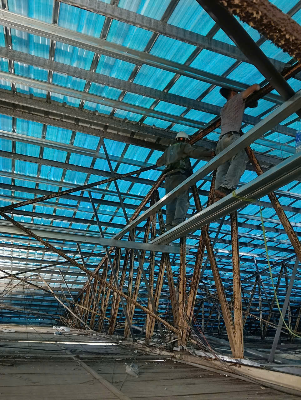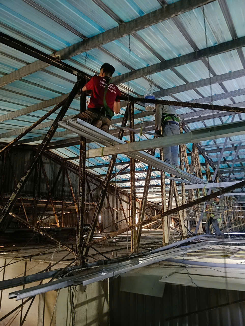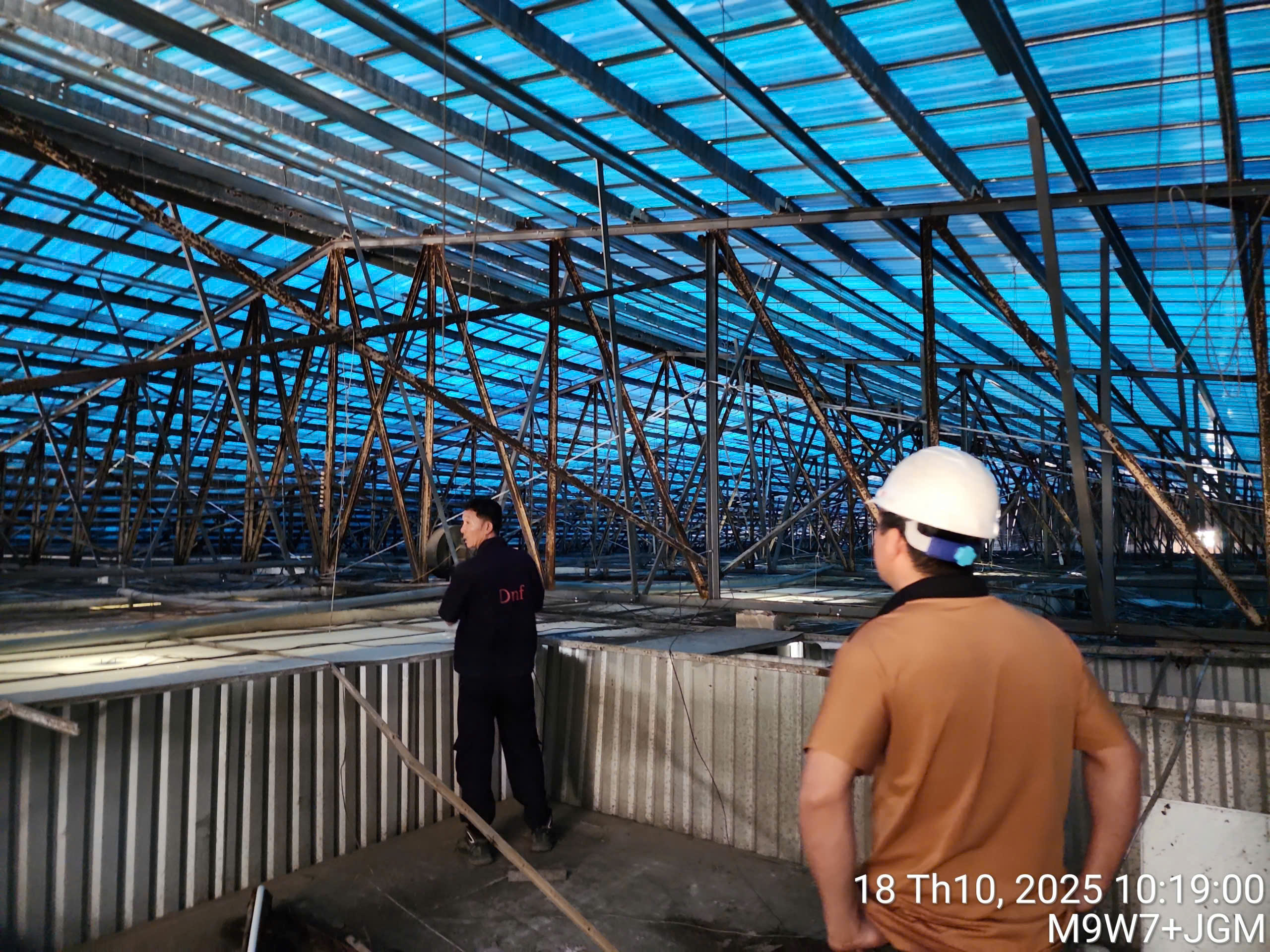 Trong quá trình thi công, đội ngũ kỹ sư và công nhân của Mega Cons đã làm việc trong điều kiện khá khắc nghiệt dưới mái tôn nóng nực, nhiệt độ cao, cùng với hệ kết cấu hiện hữu phức tạp. Công tác gia cố đòi hỏi sự tính toán kỹ lưỡng, thi công chính xác và đảm bảo tuyệt đối các yêu cầu về an toàn.