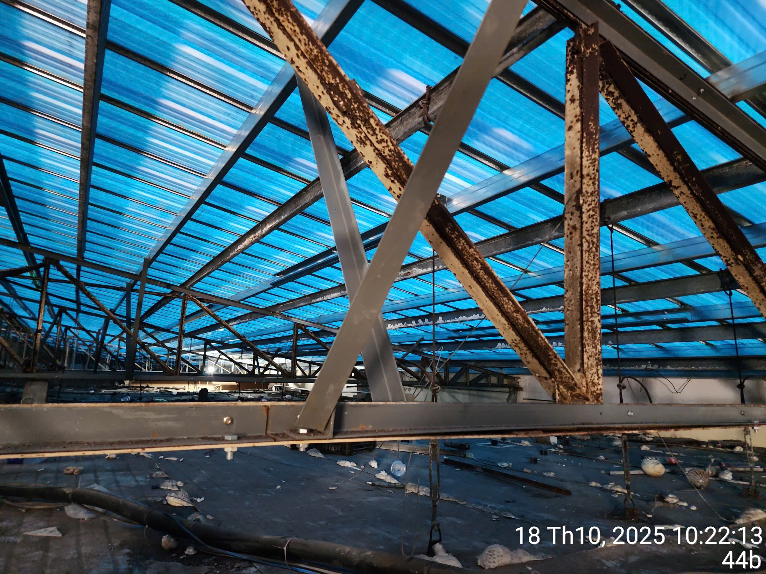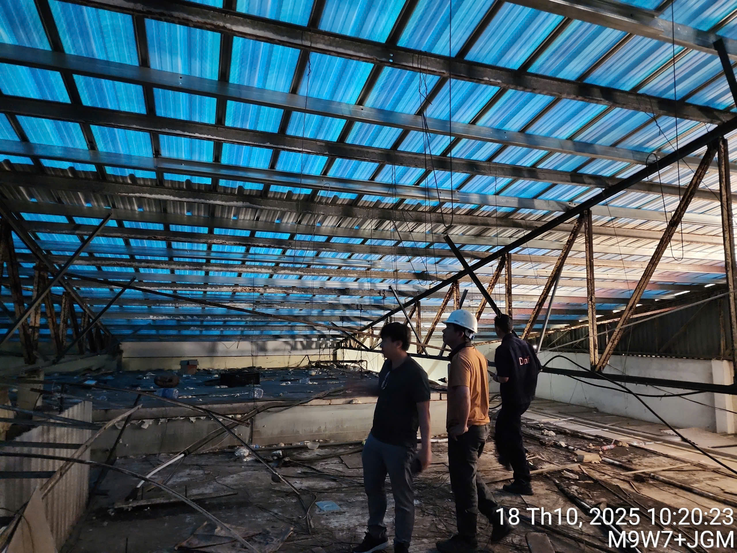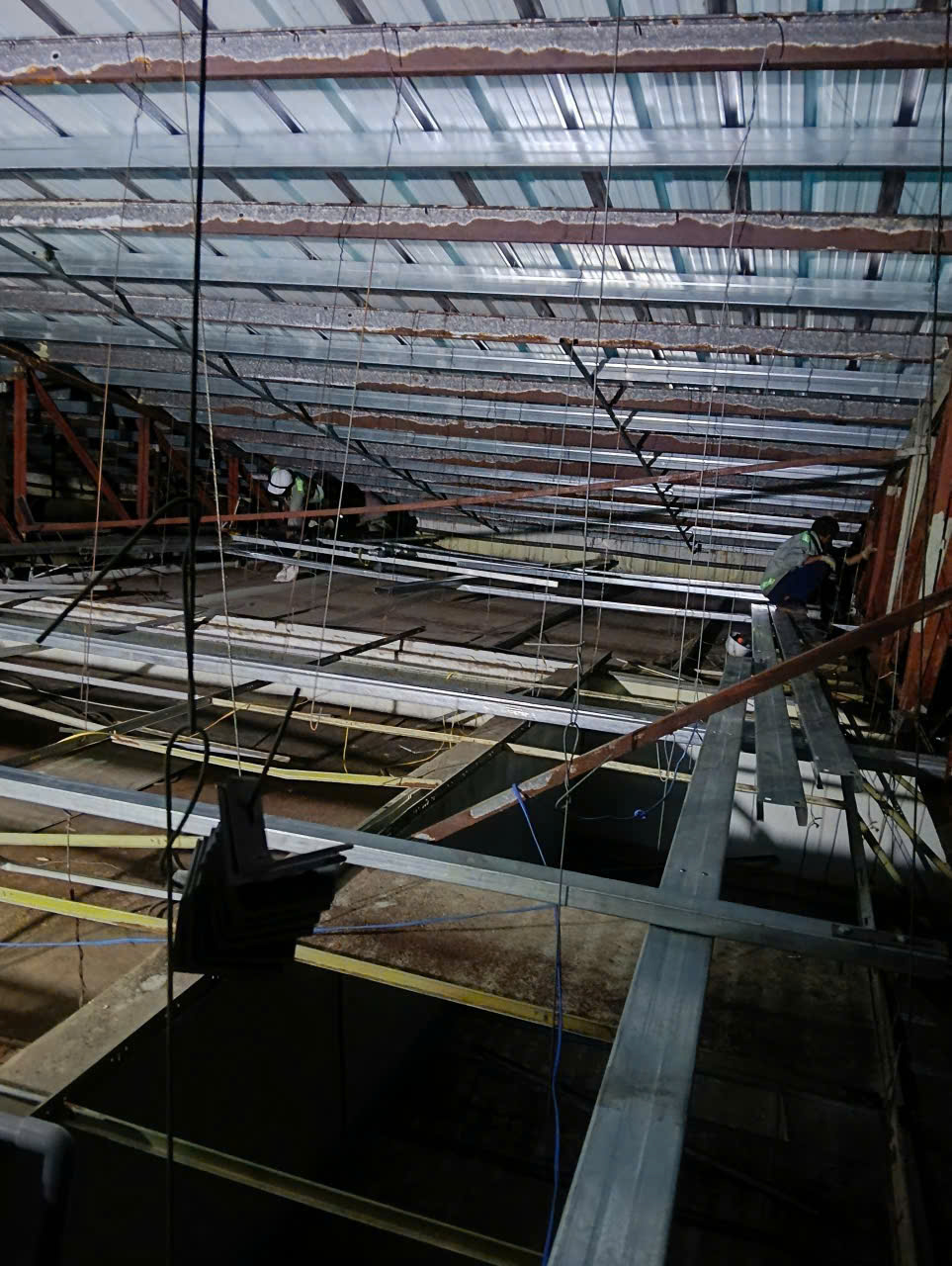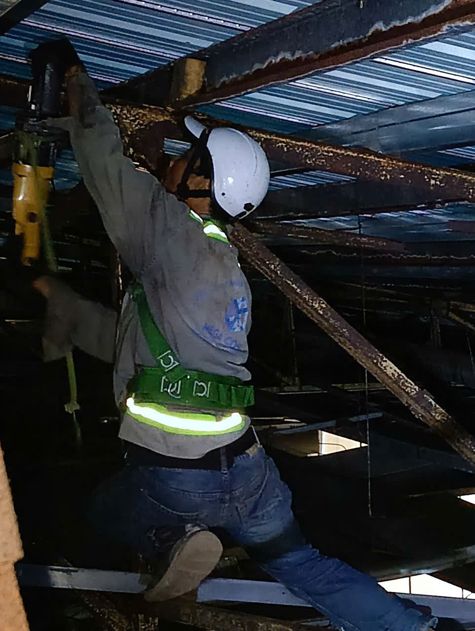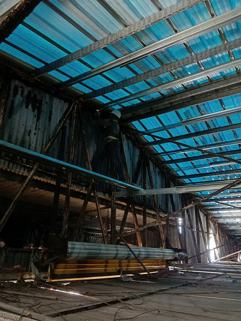 Trong quá trình thi công, đội ngũ kỹ sư và công nhân của Mega Cons đã làm việc trong điều kiện khá khắc nghiệt dưới mái tôn nóng nực, nhiệt độ cao, cùng với hệ kết cấu hiện hữu phức tạp. Công tác gia cố đòi hỏi sự tính toán kỹ lưỡng, thi công chính xác và đảm bảo tuyệt đối các yêu cầu về an toàn.